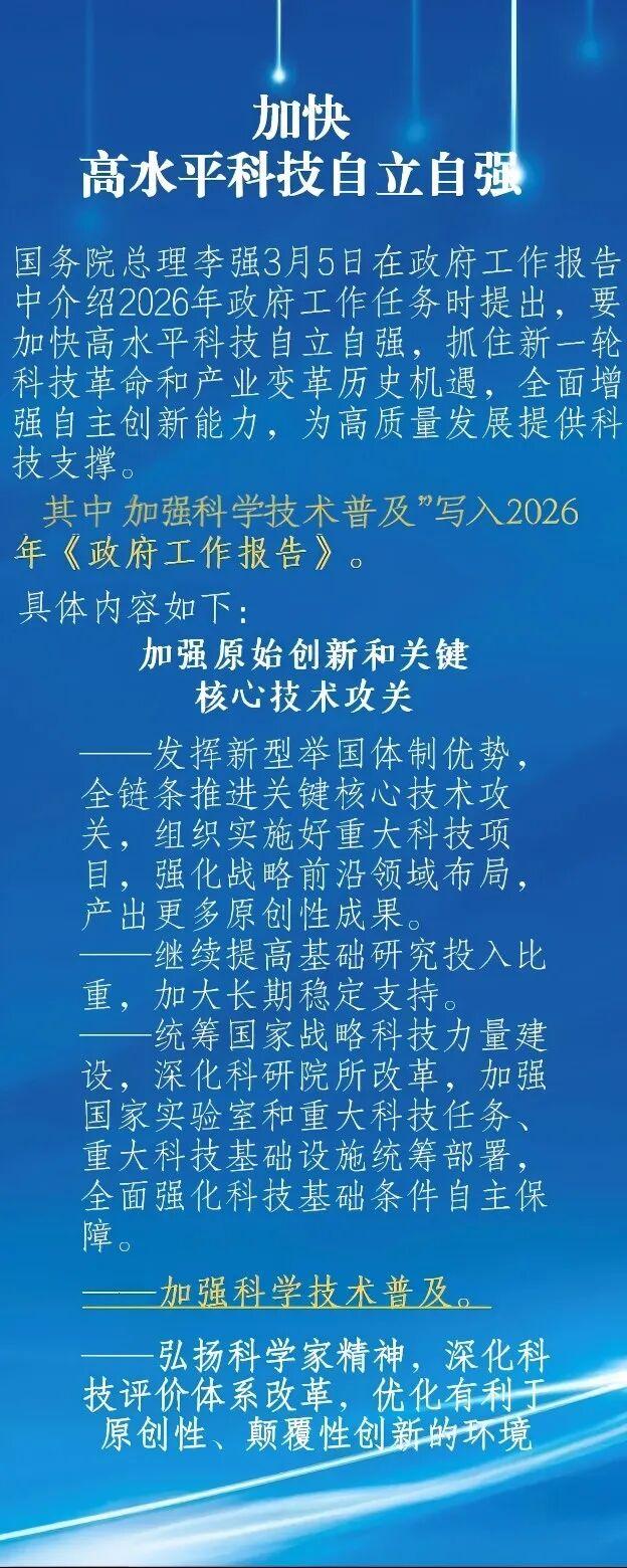 两会|最新部署:“加强科学技术普及”写入2026年《政府工作报告》