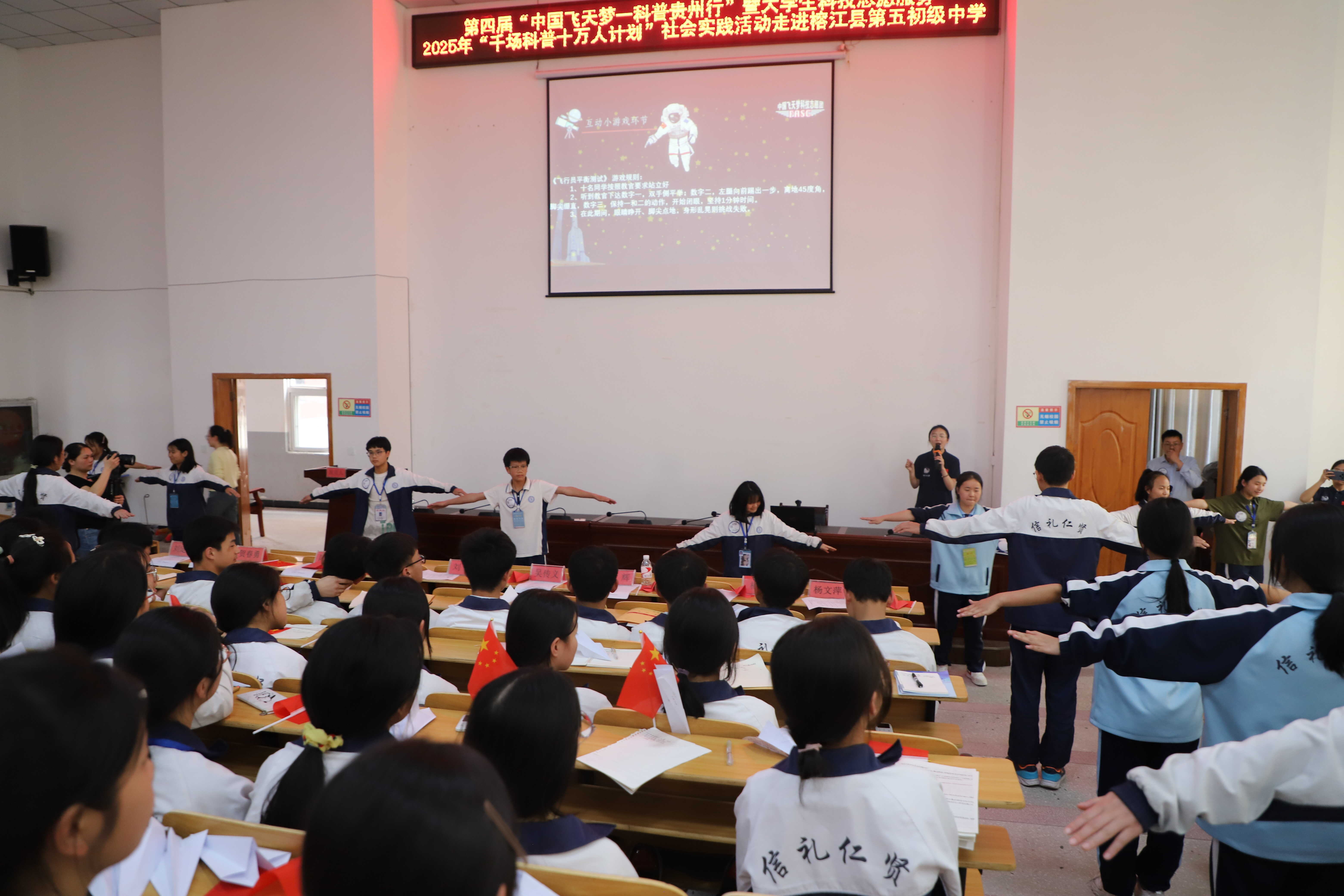 为弘扬航天精神,厚植科学梦想,2025年4月16日下午,第四届“中国飞天梦—科普贵州行”暨大学生科技志愿服务2025年“千场科普”社会实践活动走进榕江县第五初级中学。中国飞天梦科技志愿团贵州省总队社会工作部部长杨梅、宣文部部长刘婷出席活动并授课,榕江县科协、县教育局、团县委及第五初级中学相关领导参加。