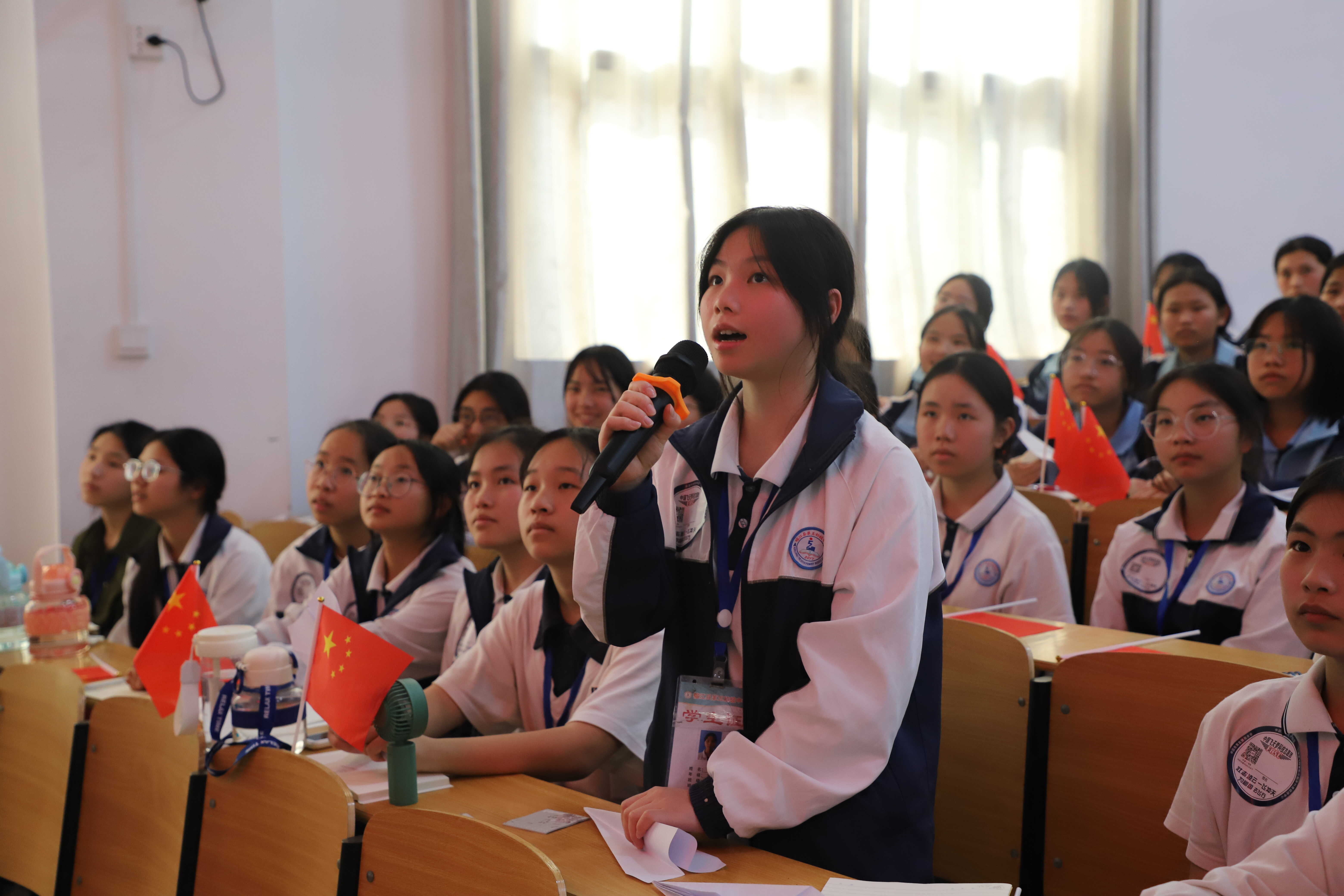 活动现场,中国飞天梦科技志愿团为500余名师生带来一堂精彩纷呈的航空航天科普讲座。志愿者们以生动的飞天探索故事引入,结合图文视频,用通俗易懂的语言向同学们介绍了飞行原理,普及航空航天知识,并组织开展招飞体验、模拟飞行等互动游戏,让同学们直观理解飞机的操控原理。沉浸式的科普体验让同学们仿若翱翔蓝天,深切感受航天魅力。现场气氛热烈,同学们认真聆听、踊跃互动,展现出浓厚的学习热情。活动最后,全体学生齐声高呼“请党放心,强国有我!壮志凌云,一飞冲天!为祖国,去飞行!”的口号,并将承载着梦想与希望的纸飞机掷向天空,为这场充满知识与感动的科普之旅画上圆满句号。