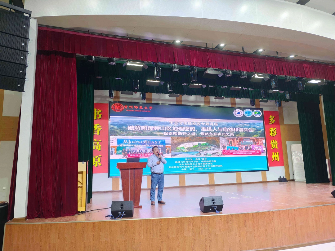 在2025年全国科普活动月热潮中,一场聚焦喀斯特生态文明的科普盛宴走进黔东南黎平县第一民族中学。9月27日,贵州省地理学会常务副会长、贵州师范大学地理与环境科学学院院长周忠发教授受邀主讲“破解喀斯特山区地理密码,推进人与自然和谐共生—探索喀斯特之谜,领略多彩贵州之美”的专题科普讲座,以深厚的科研积淀与生动的科普形式,为1000多名师生打开了认识家乡生态、践行科学保护的大门。