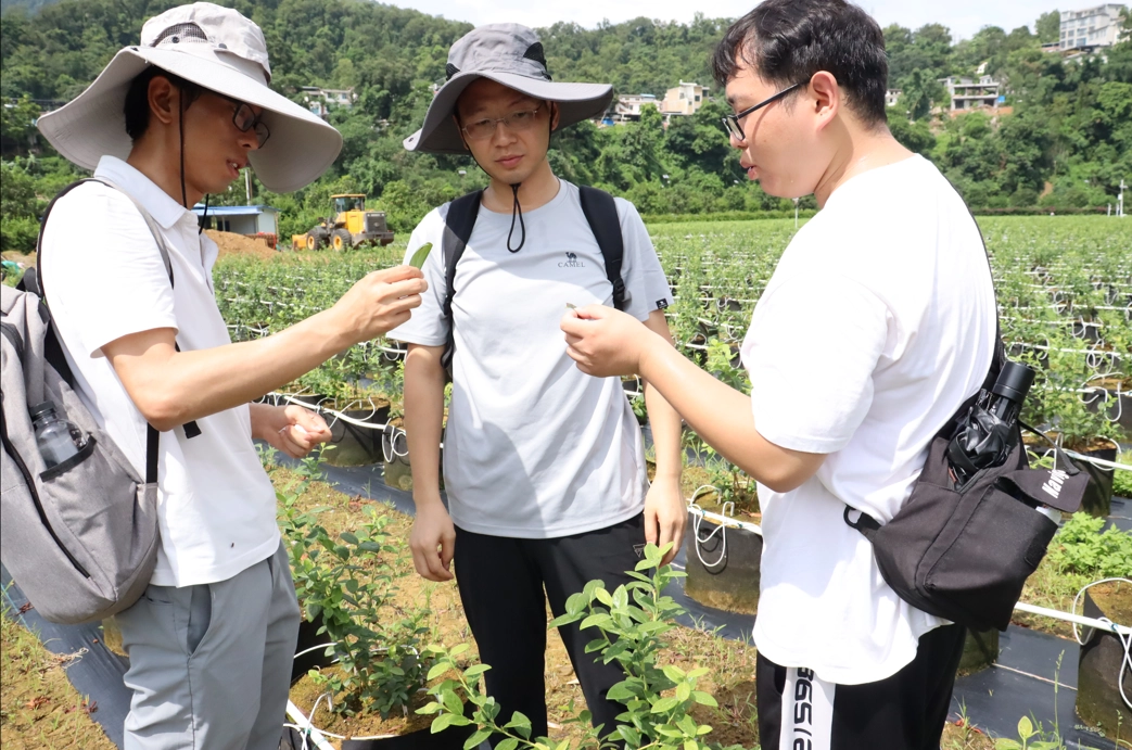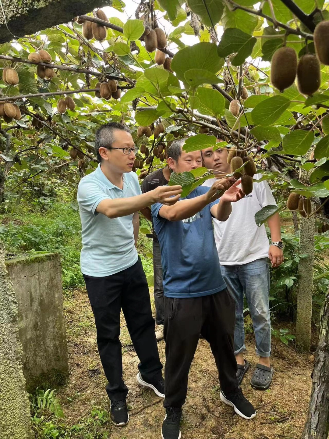 柏松(左一)在修文猕猴桃科研试验示范基地进行技术指导。