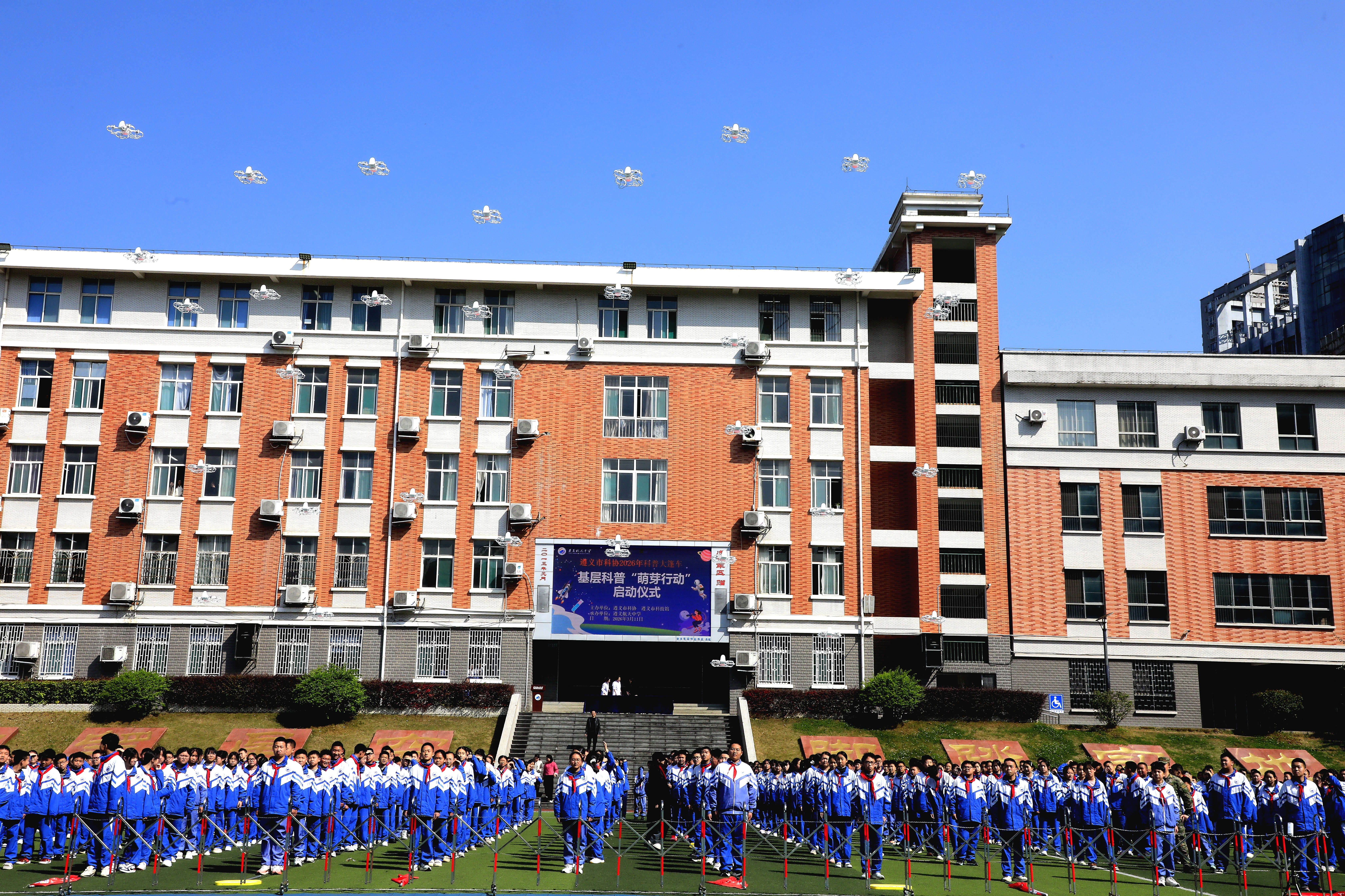 会跳舞的机器狗、炫酷的无人机编队、神奇的化学实验……3月11日,这些平日里只能在电视上看到的“硬核科技”,齐齐亮相位于广州路的航天中学,瞬间点燃了同学们的探索热情。2026年遵义市科普大篷车基层科普“萌芽行动”在这里正式拉开帷幕。接下来的五个月,这辆满载科学奥秘的“流动的科技馆”将驶入全市数十所乡镇学校,为孩子们送去一场场触手可及的“科学盛宴”。