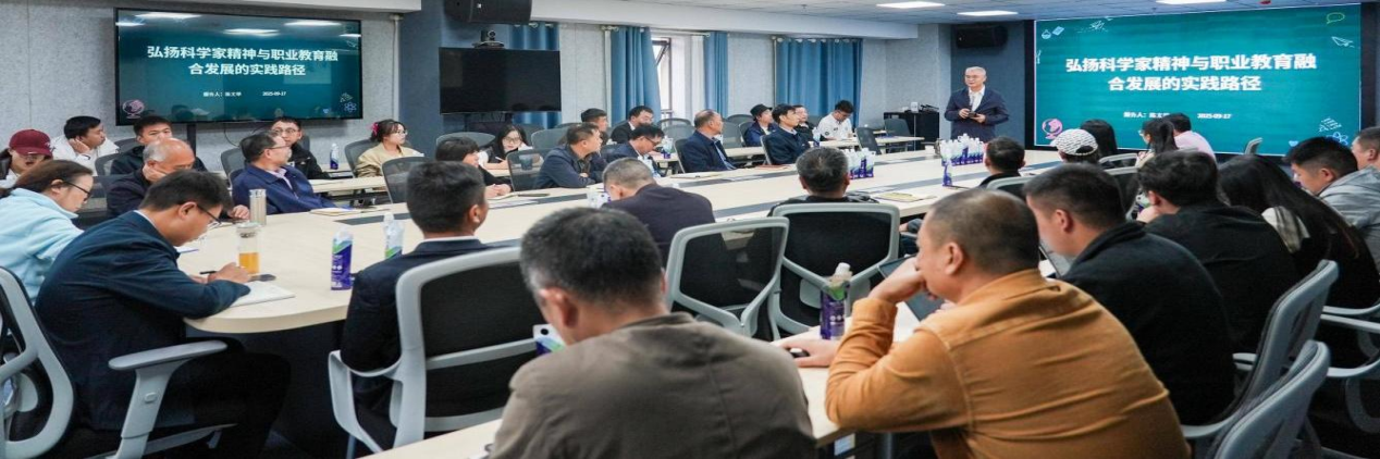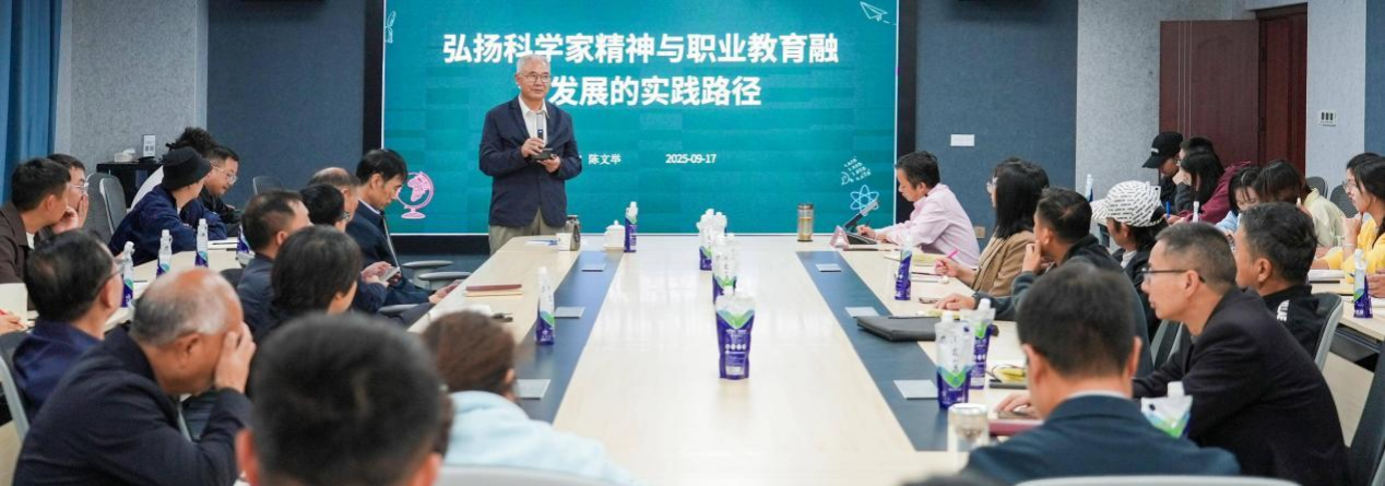 9月18日,贵州工贸职业学院举办“弘扬科学家精神与职业教育融合发展的实践路径”专题报告会,报告会特邀贵州大学老科协理事陈文举教授主讲,学院领导、各部门负责人、教师共 100余人参会。报告会由校党委副书记、纪委书记聂立新主持。