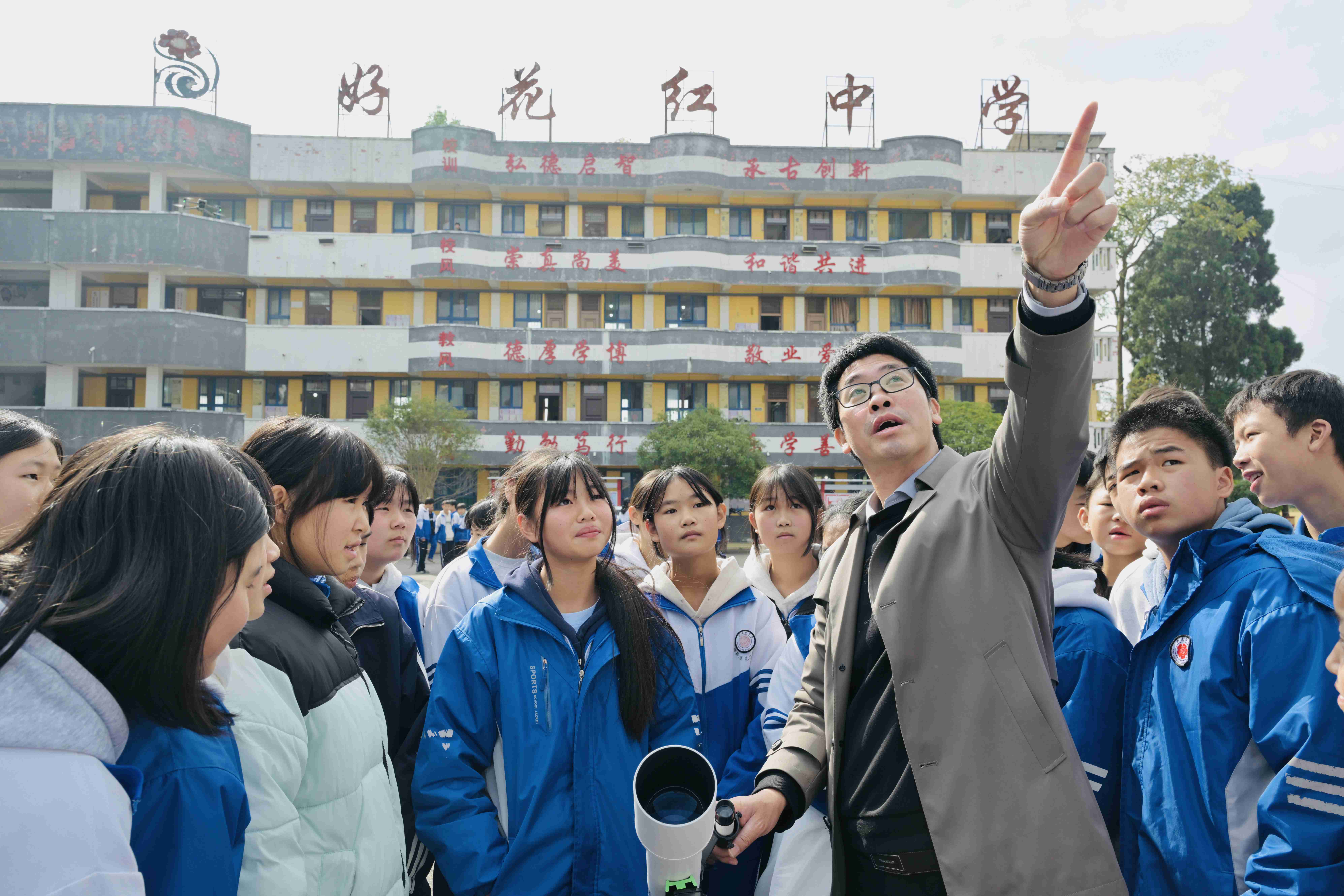 讲座结束后,周光发教授在好花红中学操场上指导中学生开展天文观测活动,指导中学生正确使用望远镜。