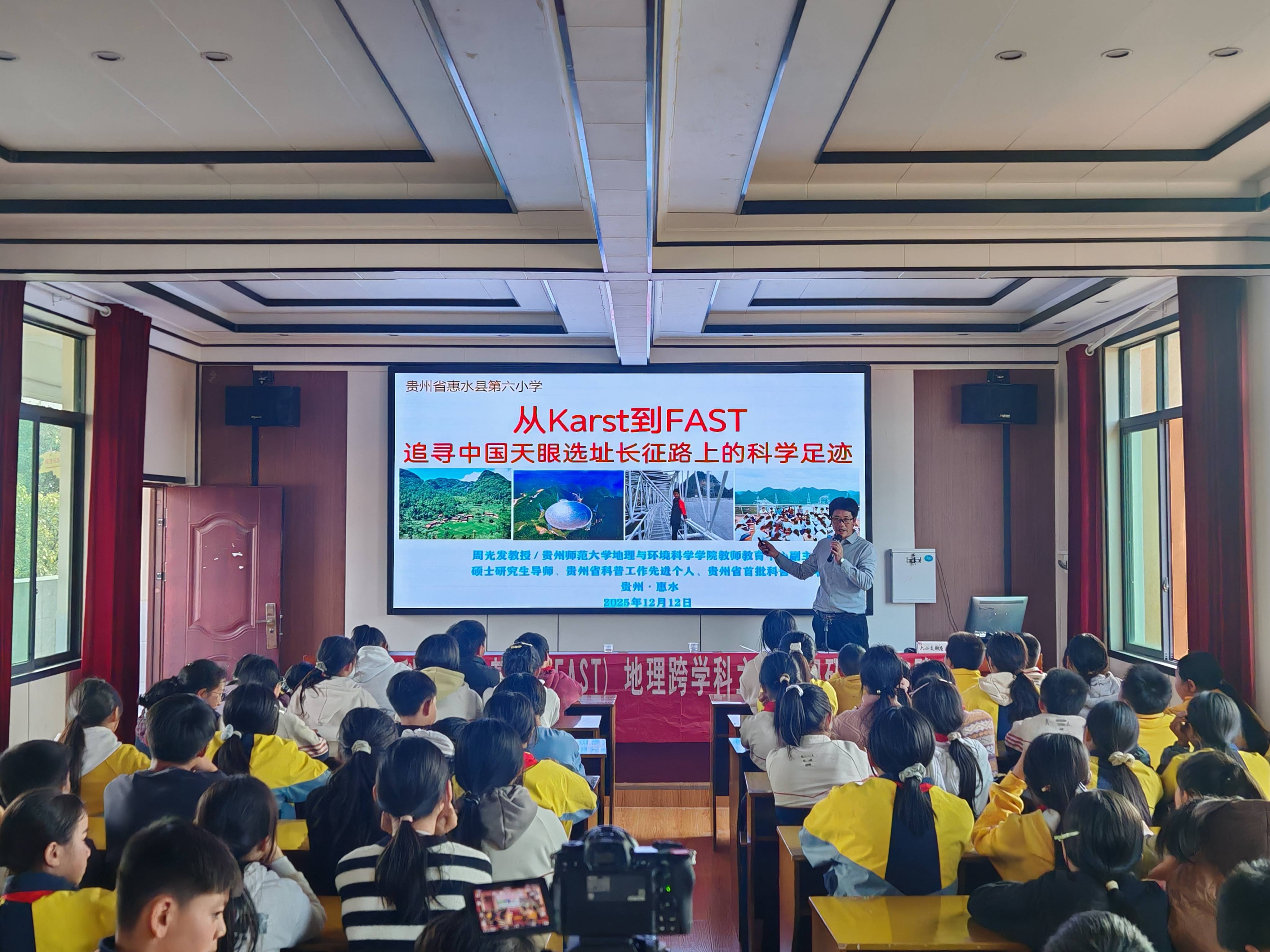 为深入贯彻国家科技教育相关文件精神,推动高校优质天文科技资源与乡村中小学教育深度融合,12月12日,由贵州省科学技术协会指导,贵州省天文学会、贵州省地理学会等多单位联合主办,黔南州惠水县教育局、县科学技术协会承办的“会地合作,启明星计划”及“从Karst到FAST:追寻中国天眼选址长征路上的科学足迹”科普活动分别在惠水县好花红中学、惠水县第六小学成功举办。